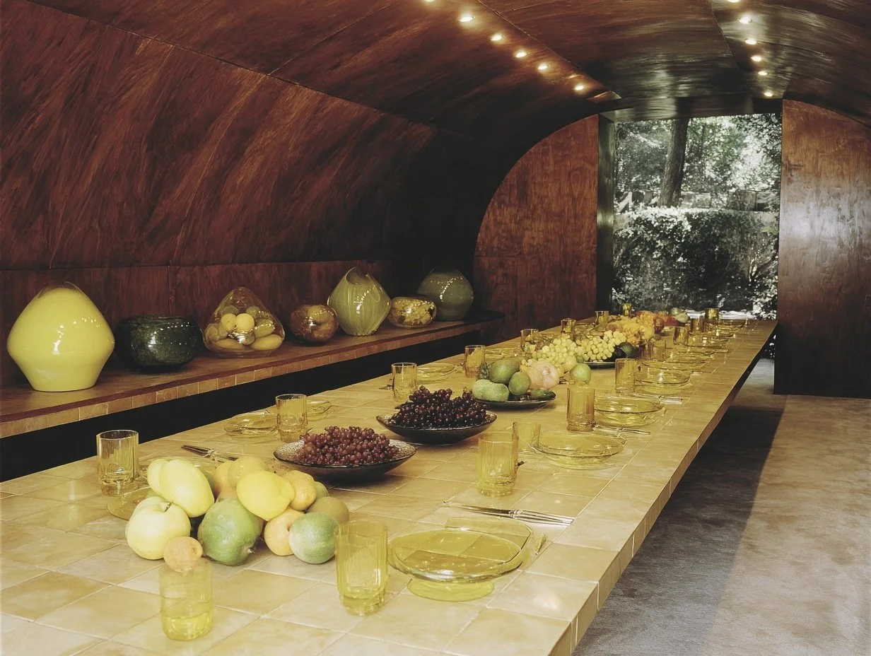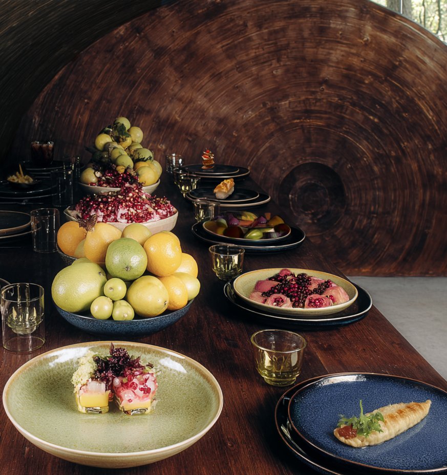 The dinner takes place inside an intimate Manhattan townhouse, where a dark chocolate–coated entry arch gives way to a warm, 1970s modernist interior, setting the stage for a refined yet immersive experience with servers in custom white jackets presenting each structural, conceptual course.