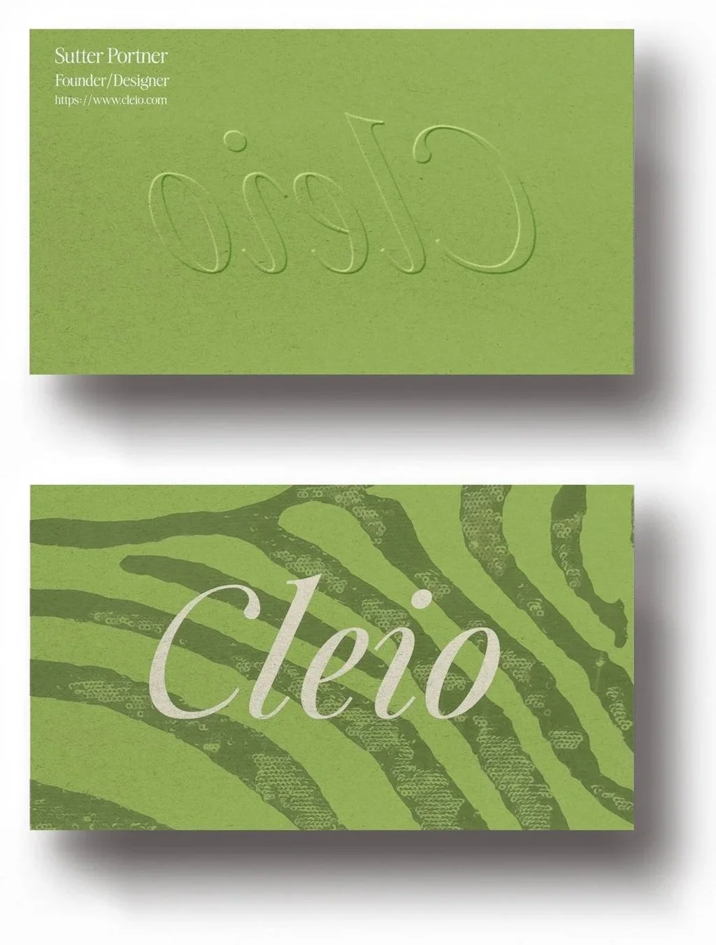The Cleio brand cards were designed in Photoshop to explore texture in multiple dimensions, pairing sequined animal prints with embossed typography to create a tactile, three-dimensional feel, while bold, high-impact colors reinforce the brand’s confident yet cohesive identity.